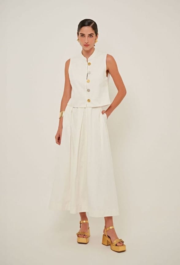 Colete Balneário e saia Baltimore, a sobriedade do branco com um toque de modernidade