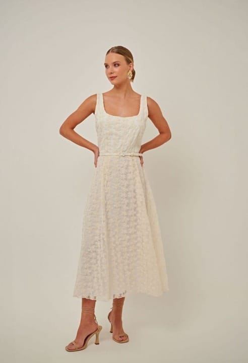 Ideal para a noite de festa ou um jantar mais formal, este vestido midi em organza com bordado floral traz um toque de delicadeza e sofisticação.