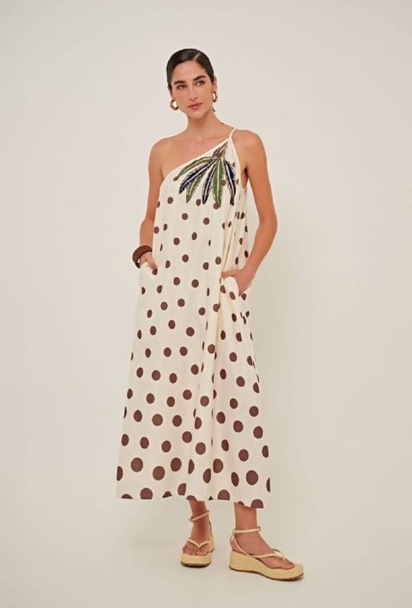 Em viscose estampada em maxi poá e com aplicação de detalhe em bordado manual, nosso vestido Cancún é a pedida para quem quer um look elegante e feminino para o Réveillon e também para os dias quentes de verão.
