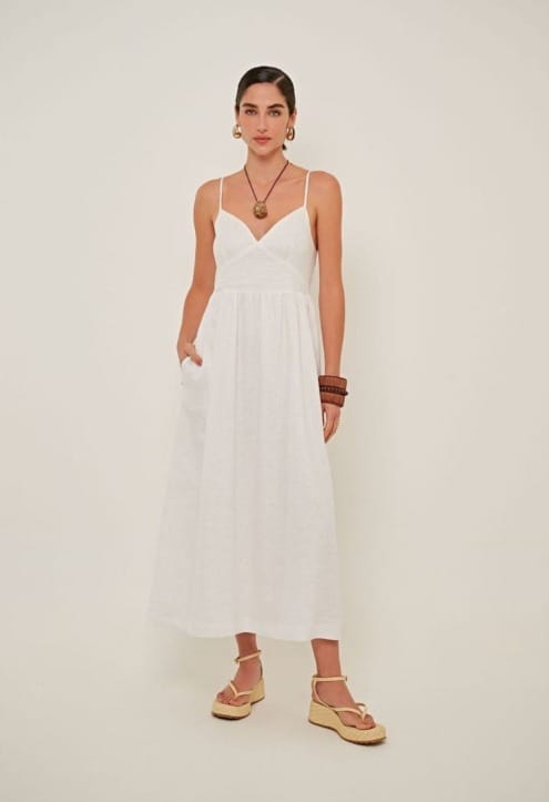 Simples sem ser simplista, este vestido é a escolha perfeita para quem busca um look que combine, na mesma medida, sofisticação e conforto. Feito 100% em linho, um dos tecidos mais frescos e versáteis, ele garante um visual clean e moderno para a virada do ano.