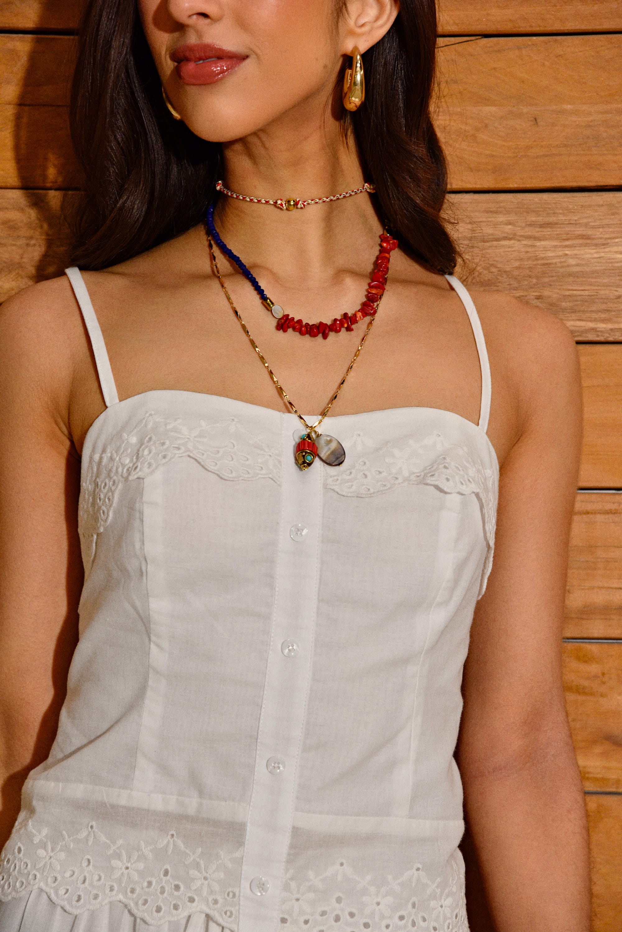 Os colares ganham protagonismo nesta temporada, trazendo frescor e personalidade para qualquer produção. Aposte nas combinações de diferentes comprimentos para criar um visual em camadas que reflete o brilho do sol. Materiais naturais, como búzios, madrepérola e pedras coloridas, reforçam a vibe tropical, enquanto detalhes dourados adicionam um toque de sofisticação. Seja com biquínis, vestidos ou camisas abertas, os colares são o segredo para transformar o simples em marcante.