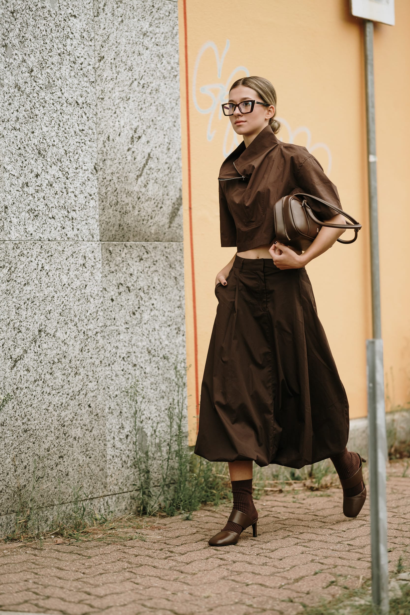- Conjuntos de sarja de algodão: como o conjunto de saia e blusa off-white, que alia a estrutura refinada da sarja com a suavidade do algodão, entregando looks versáteis que vão do casual ao chic com muita elegância.