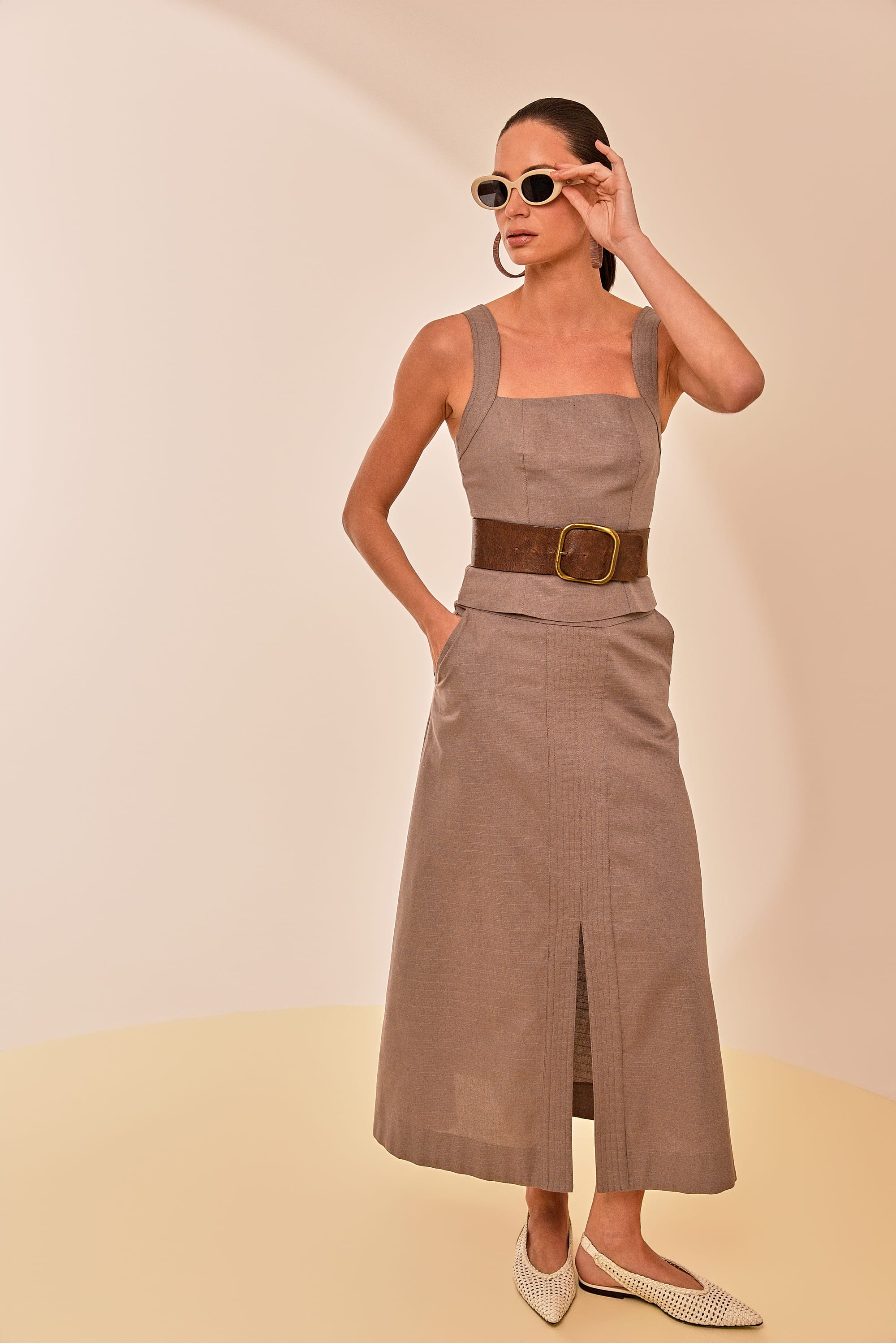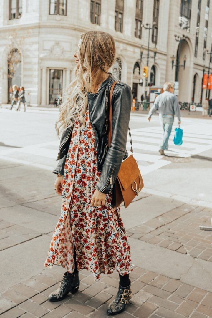 O vestido midi é a peça curinga da mulher contemporânea: elegante o suficiente para reuniões, mas leve e feminino para um jantar ou drink no fim do dia. A jaqueta de couro entra como elemento de contraste, trazendo um toque de atitude.