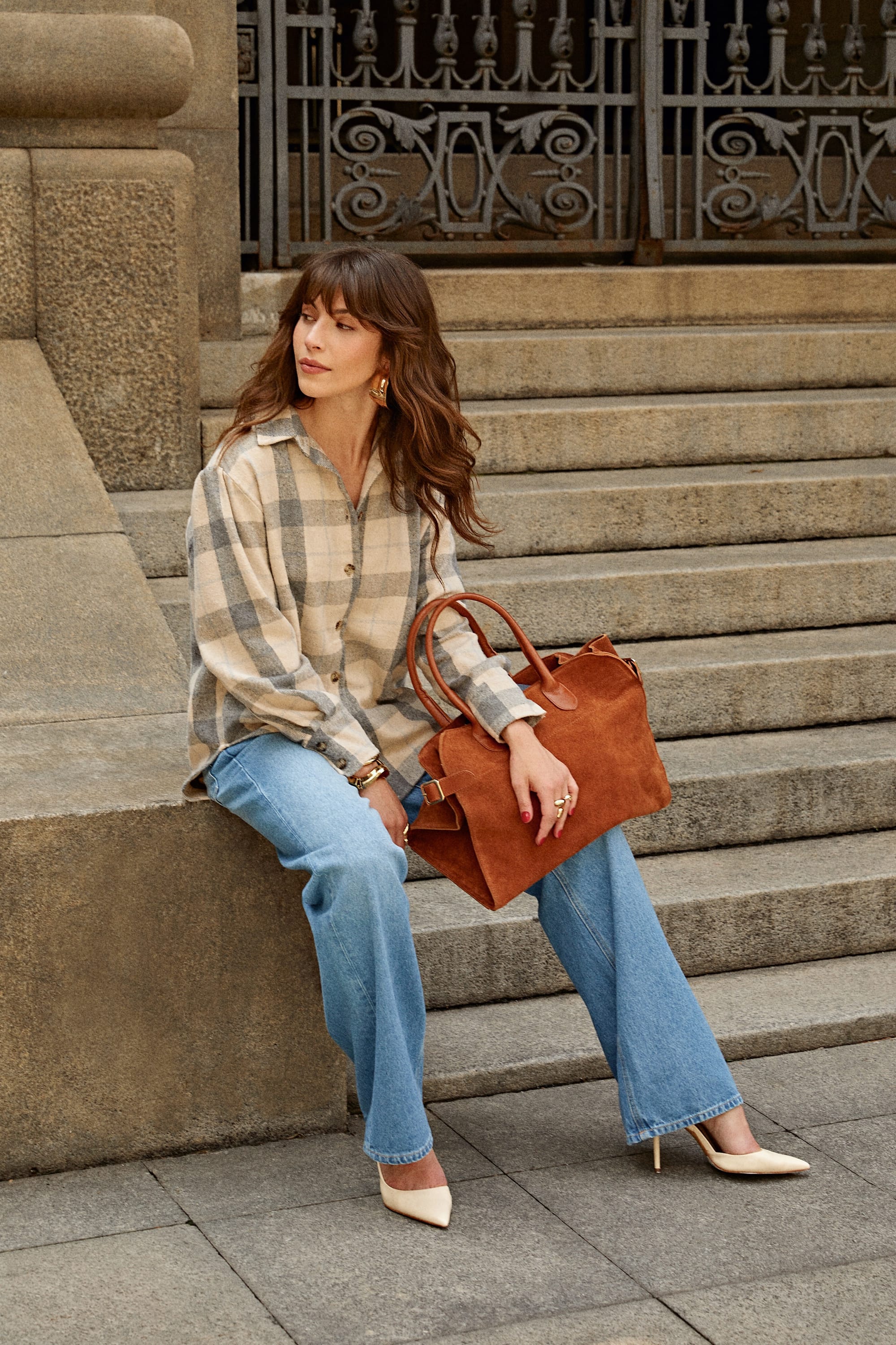 Ideal para quem busca leveza sem abrir mão da presença, esse visual aposta no equilíbrio entre conforto e estilo. A camisa xadrez de flanela — queridinha do guarda-roupa contemporâneo — ganha um ar sofisticado ao ser combinada com uma calça jeans de corte reto e um scarpin de salto alto. O mix de texturas e o contraste entre o rústico e o elegante criam um visual descomplicado, mas com personalidade. Uma escolha certeira para dias que pedem praticidade com informação de moda.